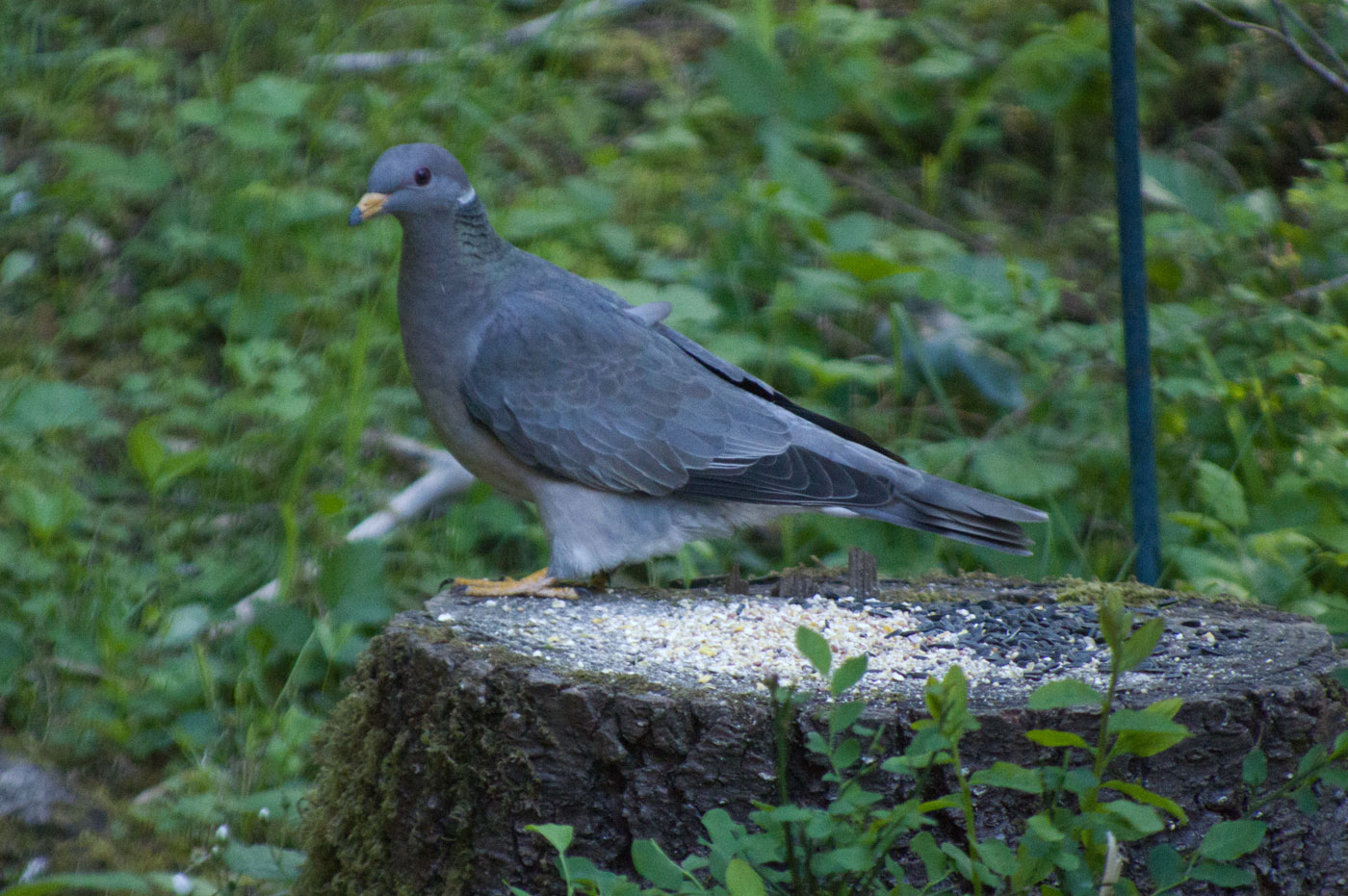 Though fairly uncommon, this is the largest pigeon in the Northwest. This is a large, ungainly, but actually acrobatic bird. It is purplish-gray in appearance. It has a white streak at the back of its neck with an iridescent patch just beneath that (esp. during mating season) and a faint black band at its tail, for which it is named. It is about 14-15 inches long from beak to tip of the tail. It has a yellow bill and yellow feet, and some black feathers at the end of its wings. It has large, round eyes which give it the innocent appearance that all doves and pigeons have.