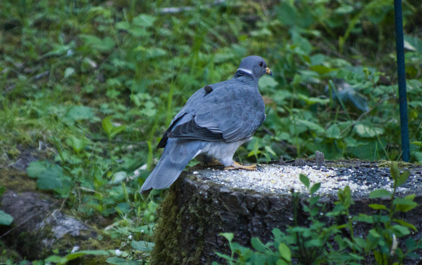 Please note that rock doves (city pigeons) and band-tailed pigeons are easily distinguishable. The band-tailed pigeons all look alike. The rock doves are in all different colors and patterns and are a little smaller than the band-tailed pigeon.