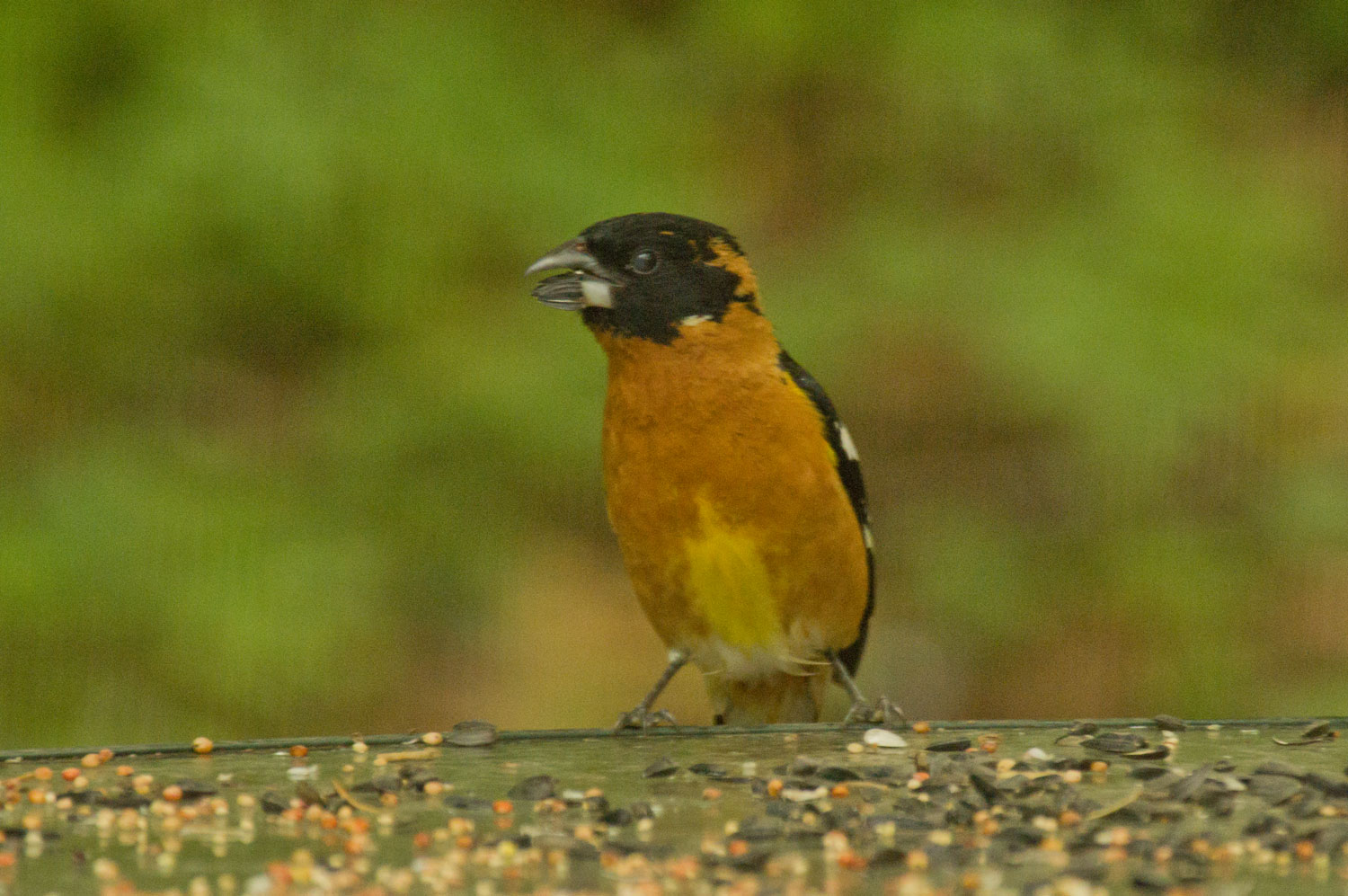 The black-headed grosbeak can be seen at bird feeders in the spring and summer. It is a plumpish bird with pretty black and orange markings with irregular white markings on the wings.. The head is all black on the male. The females and juveniles have striped heads - the male juvenile has a black striped head, and the female juveniles look like the female adults. These birds can be seen in the city woodlands and thickets and deciduous or mixed forests in the country west from southern British Columbia to the mountains of Mexico. They spend their winters in Mexico, Central America and South America. . Similar appearing birds are the evening grosbeaks.