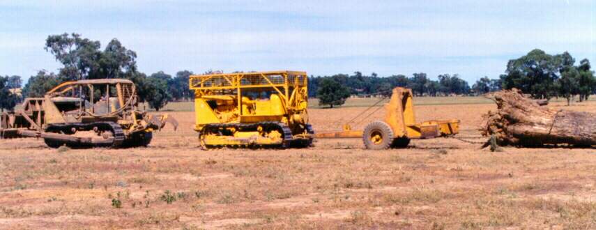 Here is another HD20 photo from Australia. I have included it because it shows some classic features of an older dozer not often captured in a photo. Of particular interest here is the blade. This is a cable angle dozer. As was typical of dozers in the early 1950's it features a front driven cable lift mechanism. There is a winch drive off the front of the engine. You can see the rod going forward on the outside of the machine. That would be the blade control lever. It is a 3 position lever--- drop, hold and lift. Typical of these winch controls is a band brake. When you lift the winch winds through the brake band and when you release the 'lift' it goes to neutral and the brake band holds it. Pulling the lever the other way releases the brake and the blade drops. the other thing to notice is that the cable then goes to the top of the radiator and turns into a 4 part line for actually lifting the blade. This slows down the action and provides the lifting power for the heavy blade. Since this is an angle dozer, the 'side skirts' can be disconnected from the C frame and the blade angled manually. Six way hydraulic angle/tilt blades had not been invented yet. The front cable control is a vast improvement, however, over the rear cable control shown on the dozer above. The rear cable control is useful for controlling towed equipment such as a towed cable lift ripper or a scraper but when used to control a blade it is not as nice. The reason is that the rear winches are PTO driven and the PTO is not "live" meaning that the blade won't work when the clutch is released. The front winches will work any time the engine is running. Additionally, of course, if you are relying on a rear cable control and want to use it for a towed piece of equipment, then you have to take the blade off, or chain the blade up in order to have the cable control for the towed equipment. The front cable control is dedicated to the blade solving that problem.