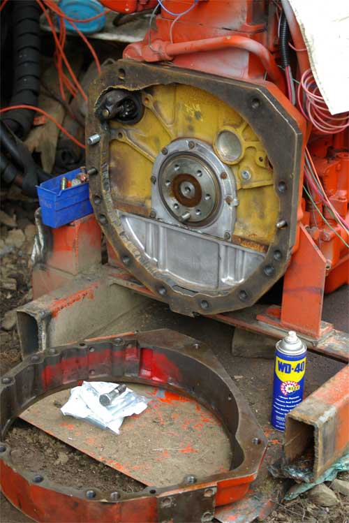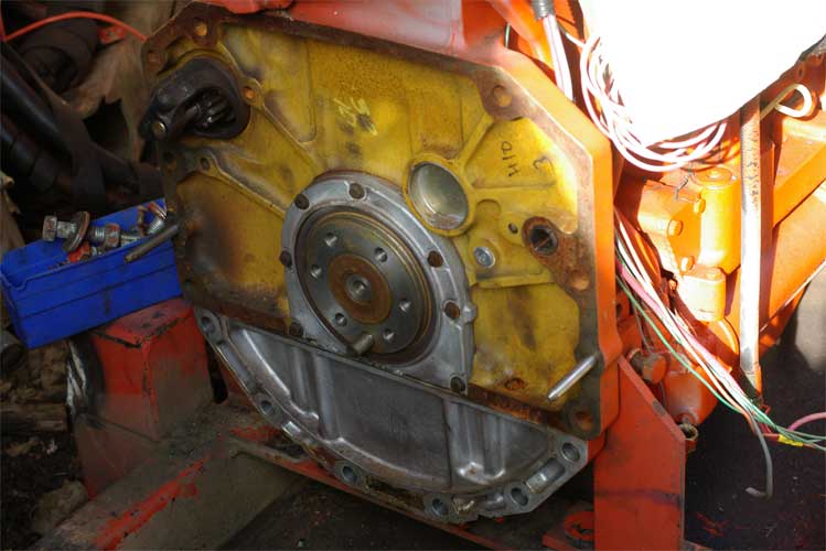 Our first effort at the repower was a failure. Our first plan was to install a Cummins L10. I was off to the auction and bought an IH goat for the right price with a Cummins L10 in it. Promptly I learned a few things. The L10 was a low flow model which is a particular type of cooling system which is suppose to use a very efficient radiator, but circulate less water than normal. This scared me, but I will never know if I could work with that o r not as other things were more discouraging. I did find an L10 with an SAE #1 bell housing which is what I wanted, but when I got it apart to my horror I found that it is almost standard in these rigs to use an SAE #2 flywheel and a bell housing with an SAE #2 starter placement. I had a big ring to mount on the flywheel that needed a flat faced SAE #1 flywheel. I shopped the second hand market for parts and came up empty handed. No one in any junkyard I could find admitted every having seen an SAE #1 flywheel and bell housing for a Cummins L10. They are in the Cummins catalog, but buying a new flywheel and bellhousing from Cummins would cost so much as defeat the cost effectiveness of the repower. The engine just looked like a money pit. The turbo charger was bad, and I was afraid of the cooling system so I abandoned that effort.
