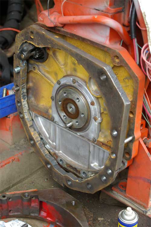 The photos on the margin should give you a sense of the issues. By spacing the bellhousing bank an inch we made space inside the flywheel for the stuff sticking out on the front of the converter. The bell housing is dowelled to protect the runout settings but that is something that we will verify. The final issue is the pilot bearing. On the Fiat Allis the Pilot bearing was a ball bearing in the flywheel. By spacing the converter away from the flywheel we also pulled the pilot shaft out of the flywheel so that the end of the pilot shaft sticks into the flywheel about 1/8" of an inch. The converter clutch is a disconnect clutch that is disconnected only when the transmission pressure drops during the gear shift sequence. The clutch is engaged at all times except during the shift sequence. We couldn't very well use a ball bearing so we opted for a steel plug driven in the flywheel with a composite self lubricating bushing.