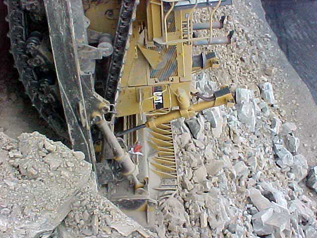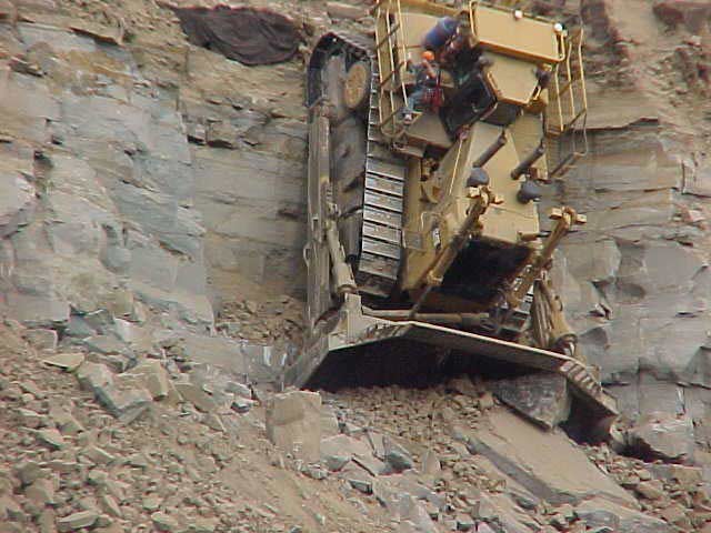 The next challenge in this scenario is recovering the machine. Calling Tripple A is probably not a solution. The incline is so steep that the engine likely would not pick up oil pressure making it infeasible even if you were crazy enough to try--- to simply start it up, lift the blade and drive it down the hill. The work around for the oil pressure issue is to dump an extra 10 gallons of oil in the crankcase. Dozers are made with special high angle oil sumps, but they usually are not designed to provide oil pressure beyond 45 degress inclination. My recovery solution would require a couple large machines. Were this mine to recover, I would put a block on the back of the machine, and run a large cable (strong enough to hold the weight of the D11) from a dead man (anchor) through the block and to another D11 stationed well away from the edge of the cliff and above the dozer. With the 'block purchase' another equal sized dozer wouldn't be drug away. Then you run lines to the bottom corners of the blade, and extend them out to one or even two machines below (and far enough back---not only for safety is something falls down, but also to provide a good angle to pull the blade out of the rocks. You then yank the blade out from under the dozer and let it down the hill on the line on the back of it. Once it had moved about the length of the dozer--into the loose rock it would be level up enough that it wouldn't be the biggest deal in town to put an operator in it, start it up and drive it the rest of the way down, particularly with extra oil in the crankcase to assure oil pressure.