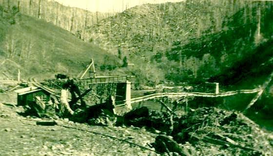 Foss was not always accessible by road. It was accessible by rail from the time the Tillamook rail line was constructed, but these other two photos show a cable suspension bridge across the Nehalem, reportedly the longest construction by the CCC. Note the Burned background and the railroad tracks passing under the end of the bridge. This foot bridge was construction about half a mile upriver from the camp at Foss..