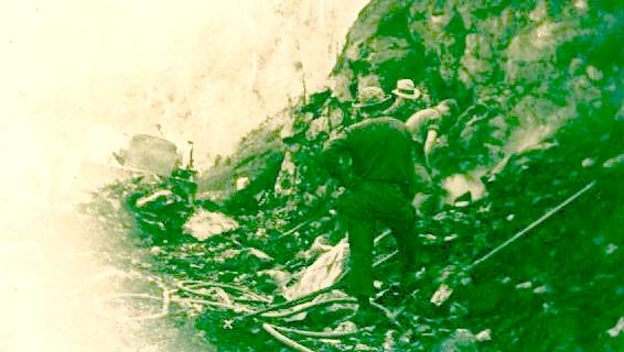 This final photo reflects construction efforts of a roadway between the footbridge and the camp at Foss. You can see that the going was difficult. You can see the rock drilling process going on in preparation for blasting the rock and a dozer in the background to handle the mucking.