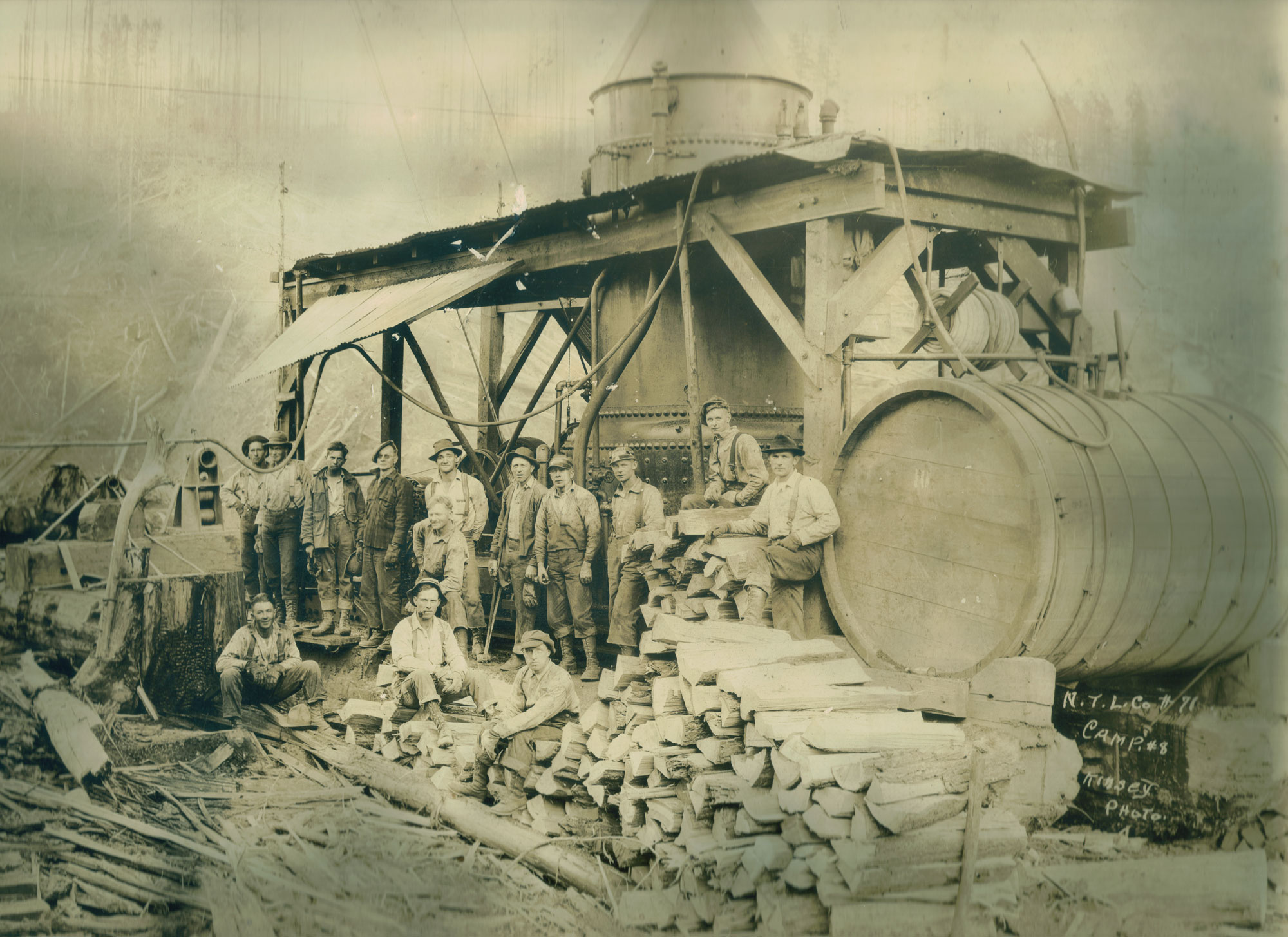 The is a yarder associated with Camp 8 which was located part way up the Hill toward Scappoose from Pittsburg. The NTLCO marking on the photo stands for "Nehalem Timber and Lumber Company". The fellow sitting down smoking the pipe is believed by this writer to be Frank Wikstrom, a sister of this writer's paternal grandmother.