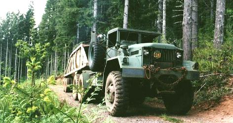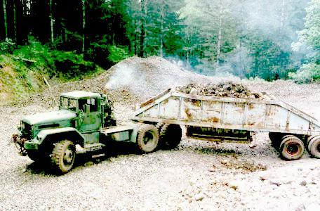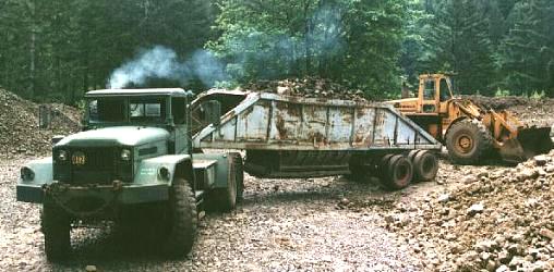 One of the things that every logger must have is some roads which are usable. This means rock roads because it rains too much to expect a dirt road to be unable more than a month or two a year. Once you find some rock the next task is getting the rock where you need it. Dump trucks can be used but belly dumps are seeing increasing popularity. You see dump trucks have their problems (see photo). The problem with a belly dump off highway is only avoiding getting stuck. They are a bit of a disaster if matched with a highway tractor in an off highway application but they do nicely with a large 6X6 tractor.
