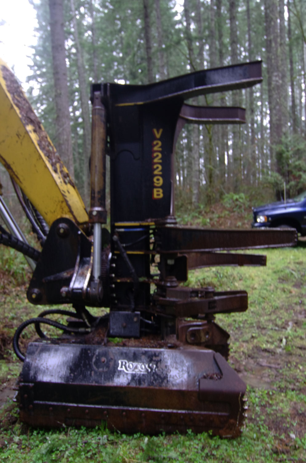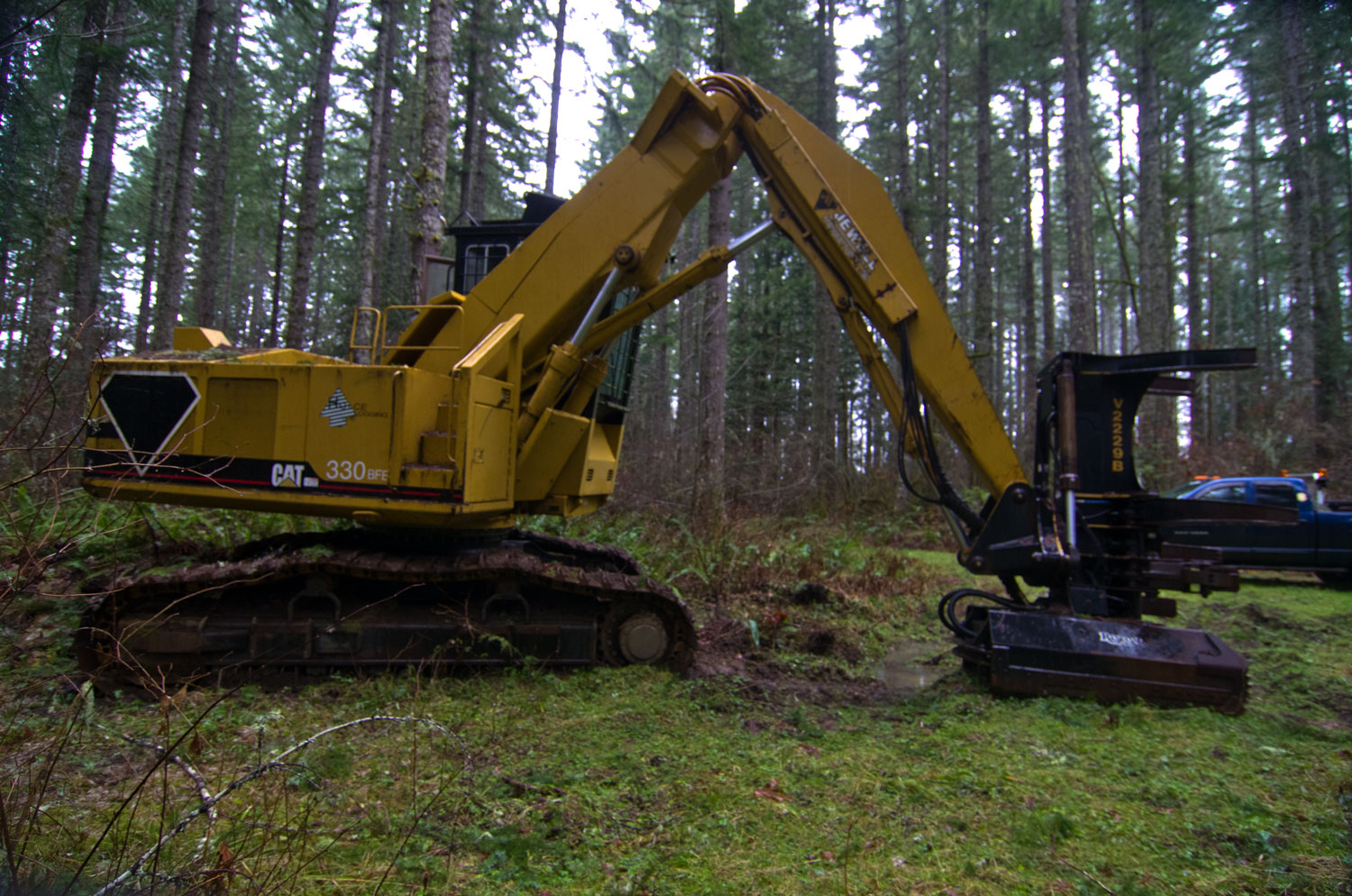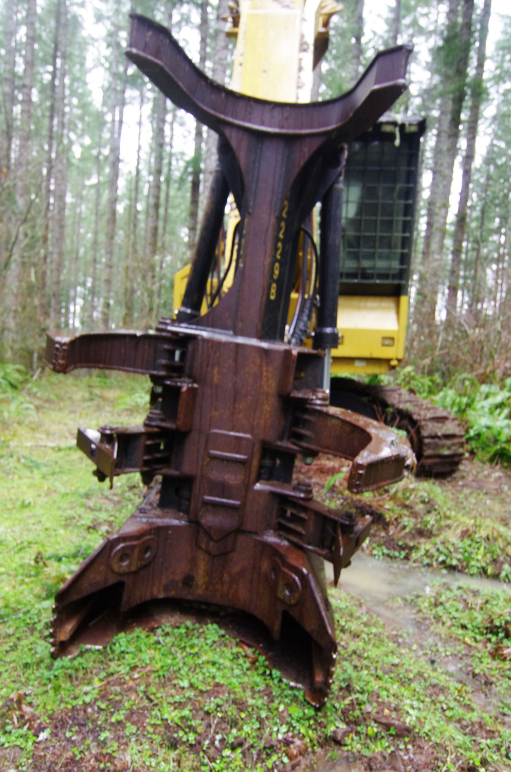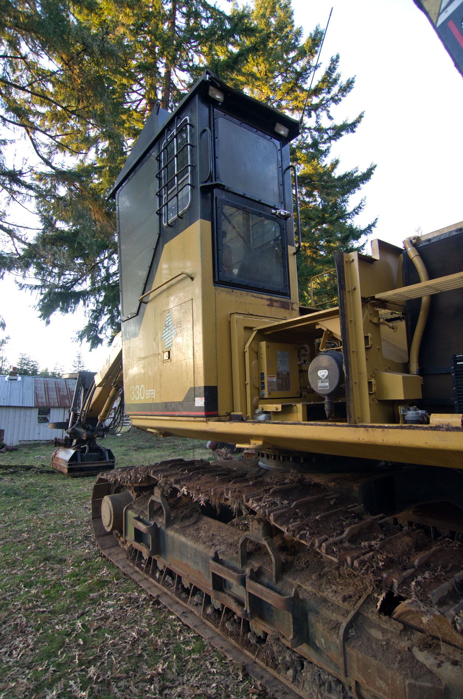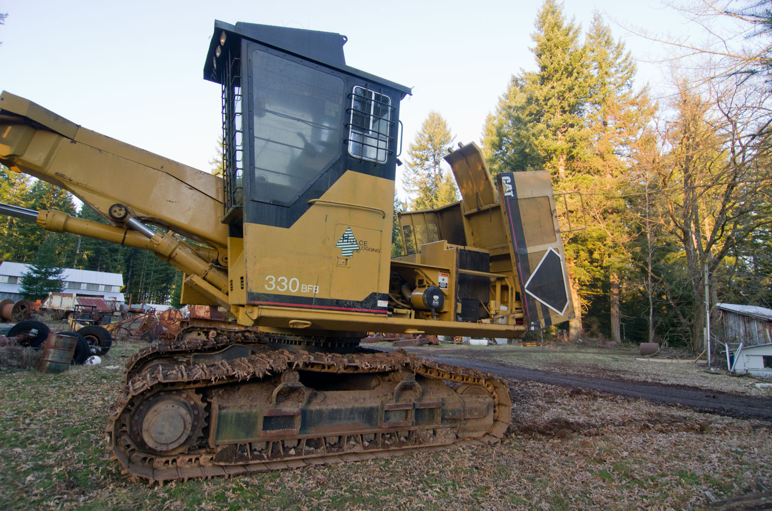 This is a Caterpillar 330 excavator with an aftermarket Feller Buncher modification by Jewell Manufacturing of Portland, OR. It has a special cab, and armor allover the house. They cab hydraulically tilts forward to lower the height for transport, and various lids have hydraulic cylinders to open them so you can access the innards of the machine. The Jewell Boom is a special boom with all the hoses guarded. The cutting head is a Risley rotosaw.
