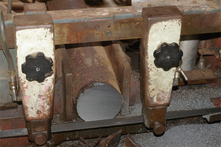 The photos here present a power hacksaw which is actually a band saw. To speed the cutting and save the blade from overheating, the blade is aggressively cooled with water and soluble oil which is plumbed through the saw guides and caught in the drip pan and recycled.