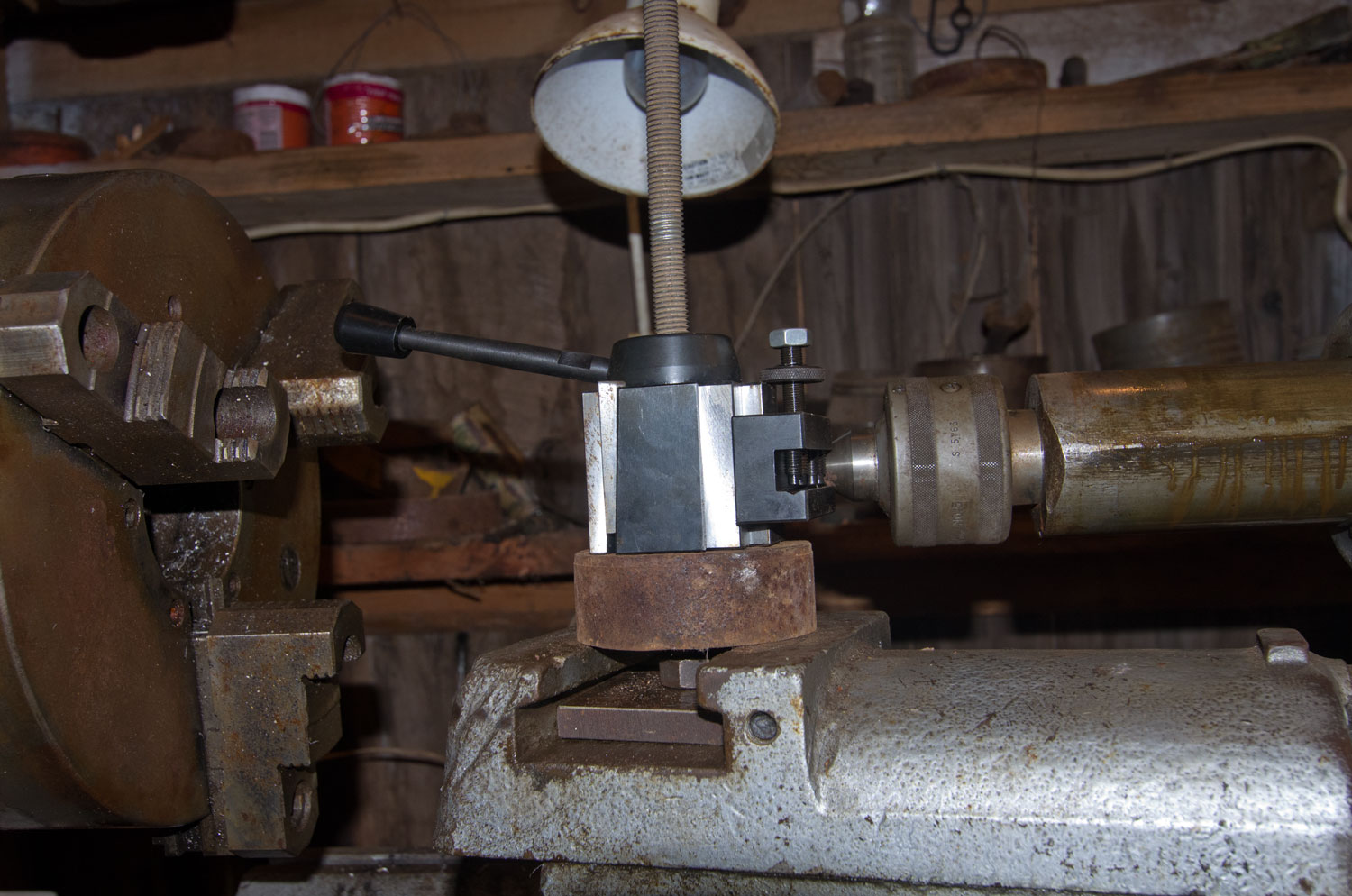 The second thing I needed to do to use the post was to block it to a height that made it usable. The tools can be adjusted within a 1 inch range on the post, but to get the post within range, I needed to block it up 1.5". I was going to need some block anyway because the post was too small to sit on top the compound and adequatly clamp down. I found a 4" round scrap in the shop 1.5" thick and decided that was just right. I cleaned it turned it true, fit it with a 5/8's center hole so it would stay centered and I was in business. The 4" diameter was big enough to clamp solidly to the compound, yet not so big as to provide clearance problems