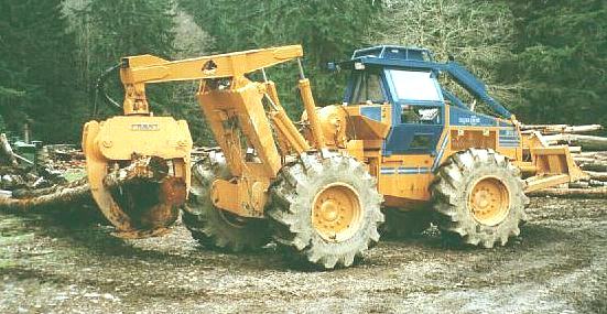 With the dawn of 1996, Morgan Silva Com ( a Canadian start up company) and released a completely new idea in log skidders. To use a phrase of some political people, they have reinvented the log skidder. Nearly every log skidder ever made has been mechanically driven and steered via articulation. The only except that this writer knows of involve some early Pettibone skidders which were steered with steering axles on both ends, and a Portland company (Westfall) who briefly built a large skid steer log skidder. This writer saw a Westfall just once on a equipment lot in Portland in thte later 1960's. The machine was something else. It had Cummins power that went back to a 3rd member under the operators seat. From there the power went out to the rear wheels and then forward in chain boxes much like skid steer loaders of today. The machine was simply large however, as I recall mounted on 18x25 highpressure truck tires. There was a very little bit of steering designed into the front axle. It isn't clear to this writer if it turned in the chains or had a ball joint that would turn a little. Primary steering however was 'skid steer'. Behind the cab was a winch and on the back was a loader with forks for loading logs. There was a fair lead in the middle of the rack so you could yard logs with the winch using the loader as an adjustable height arch, and then pick up the logs on the forks and load them. The front of the machine had a blade. A wonderful all in one machine. Too bad it didn't work.