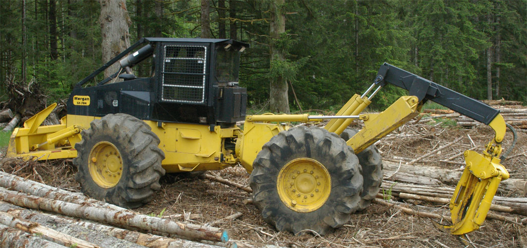 TreeTow has produced the swing grapple for this machine. It has a 12 foot reach which is more than the reach provided by current production ESCO or Young Swing Grapples. The Swing grapple is particularly suited for thinning operations. They typically won't pull as much wood as a fixed grapple because of their positioning, but, you can fish trees out of the woods that you simply cannot get with a fixed grapple, and they will pile the logs in the landing without driving over the pile which reduced breakage. While the fixed grapple may be the choice for working behind a feller buncher or other mechanical harvester that leaves several logs in a pile, the swing grapple is the clear favorite for hard to get logs and thinnings.