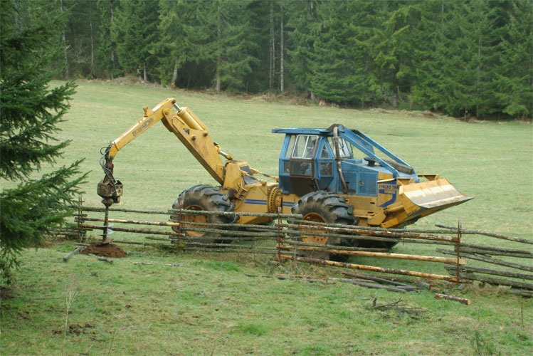 When we decided the truck was at the end of its life we bagged the digger and adapted it to fit the skidder using the same circuit that closed the grapple. Here it is shown drilling holes to plant some hardwood nursery stock. You could I suppose dig in the nursery stock with a backhoe, but the drilled holes provide an even consistent hole with well pulverized soil and are our choice.