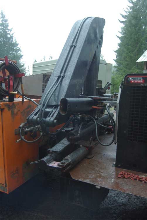 We bought it second hand and it has served us well. Once we replaced it with a newer truck for our general purpose flatbed we had to think of something to do with it. we had purchased the articulated crane some years previous with the idea of putting it on this truck but had never gotten around to it. This particular crane had actually be a 'traveling crane' in its previous life but we removed the traveling features so it could be attached in one place. In case you haven't seen them, a 'traveling crane' of this type is on a track imbedded in a flat bed truck. It can run the length of the truck implying that if the truck is pulling a trailer, it can get back to the back of the truck and reach the trailer. This type of a folding crane is popular in Europe and is usually associated with the name HIAB. There is no label as to who made this crane but I assume it is a HIAB. It has been around for a while. As originally configured it had its own gas engine and hydraulic pump on its base making it completely self contained. The gas engine was dead so we dispatched it and the pump and instead plumbed it to the wet kit that we had on the truck for the hoist that used to be under the flatbed. Our vision here was to make an off highway service truck that would support our logging operation.